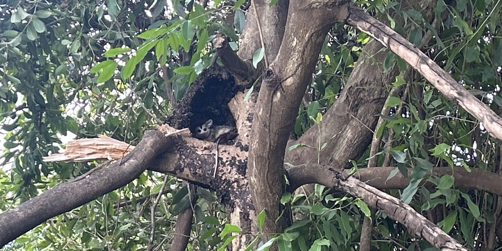 Durante um dos ciclos de monitoramento ambiental, os técnicos identificaram uma fêmea de gambá-de-orelha-branca (Didelphis albiventris) abrigada em uma árvore junto aos seus filhotes. Como se tratava de um ninho ativo, o protocolo técnico e os princípios de bem-estar animal determinaram a adoção imediata de medidas de proteção.